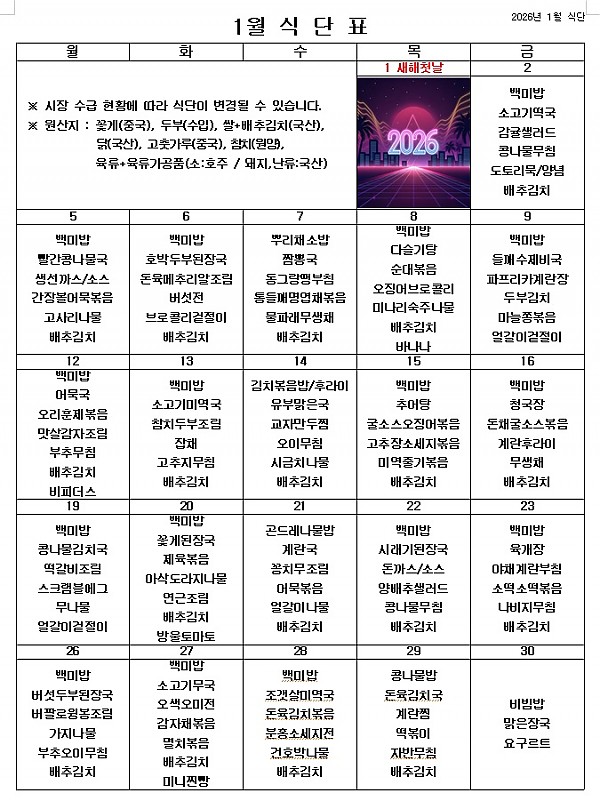 2026년 1월 식단표 ^^ 페이지 정보 작성자 관리자 작성일25-12-30 18:46 조회28회 댓글0건 이전글 다음글 목록 본문 새해를 맞이하여 밝고 건강한 마음으로 1월도 맛있게 먹고 열심히 일하겠습니다. ^^ 이전글 다음글 목록