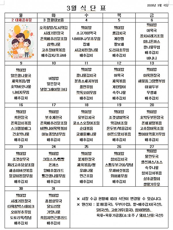 2026년 3월 식단표 ^^